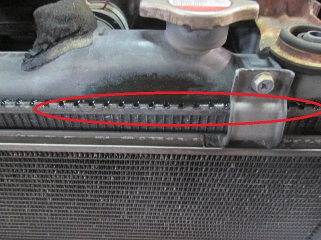 アッパータンクとコアの合わせ目から冷却水が漏れ出でいます。