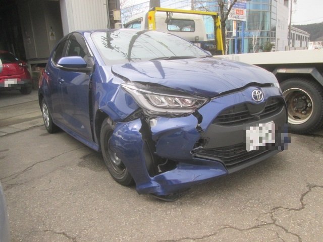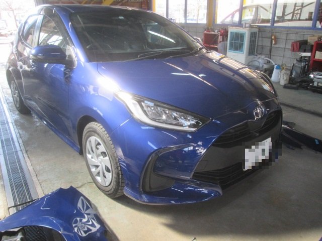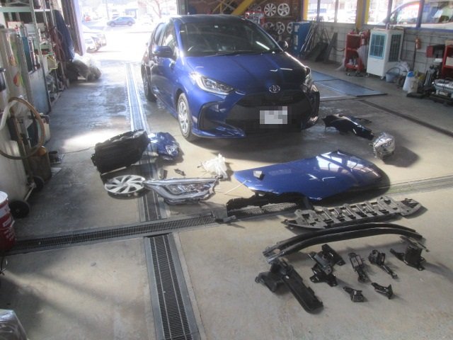 KSP210 ヤリス フロント部修理 板金塗装 フロントバンパー取替 フードパネル取替 ヘッドランプ取替 フェンダーパネル取替 福井市