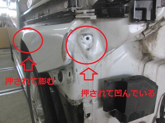 後方からの衝突でリヤフェンダーパネルが押されて側面が膨らんでいました。かなり広範囲の鈑金が必要でした。