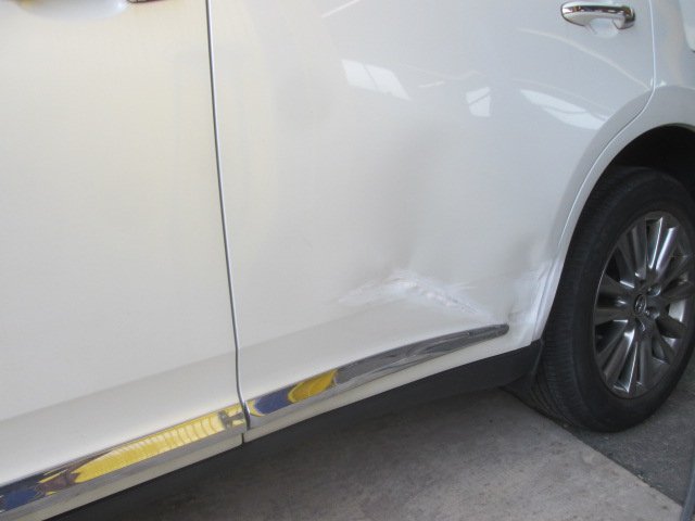 左のリアフェンダーから、リアドアにかけてのキズです。ドアはパテを最小限の面積に抑えて、修理しました。修理費用もできるだけ抑えてキレイに仕上がり、お客様にもよろこんで頂けました。