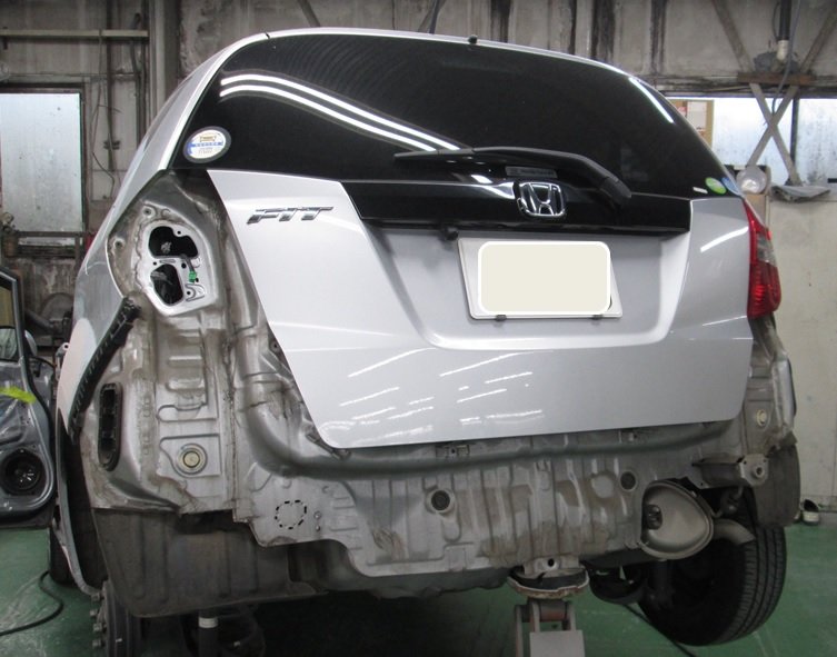 東村山市 秋津町 ホンダ FIT フィット 左リヤドア交換塗装 左リヤフェンダー鈑金塗装 リヤバンパー鈑金塗装 左ロッカーパネル(ステップ)鈑金修理 鈑金塗装修理