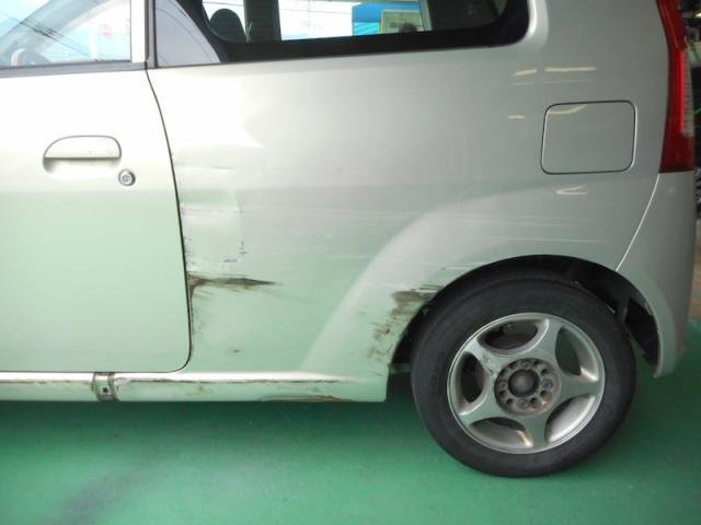 今回の事例は、大きく凹んでしまったダイハツミラのリヤフェンダーを交換せずに鈑金で直しました。
