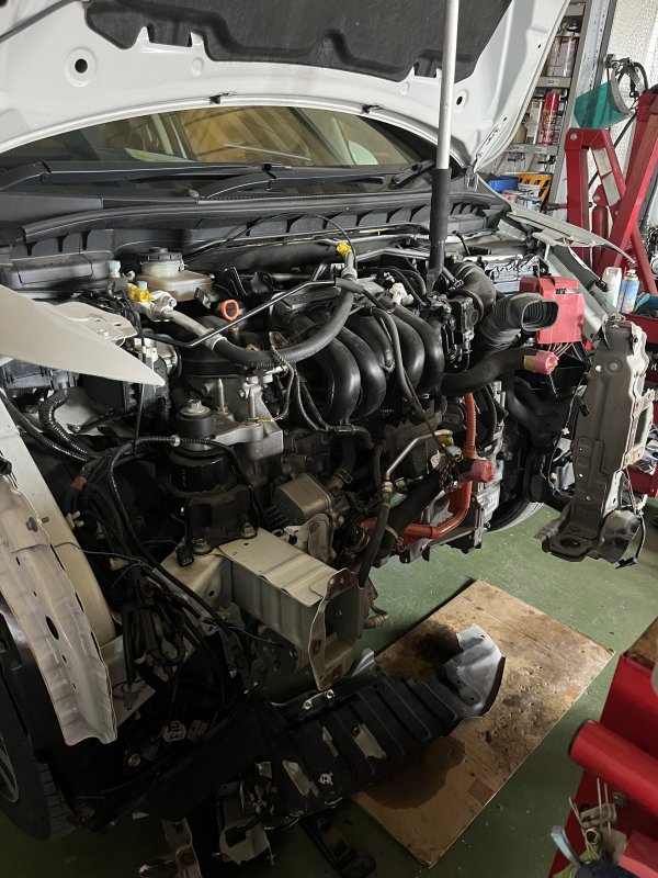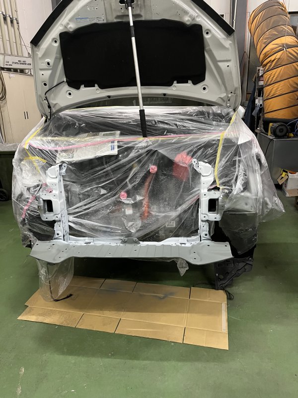 縁石を乗り上げてしまい、走行不可能になりレッカーで入庫しました。バンパーを外すと骨格部品の損傷が酷く保険修理する事になりました。潰れた部品を切断後、新品部品を溶接してバンパーも違和感なく取り付けできました。