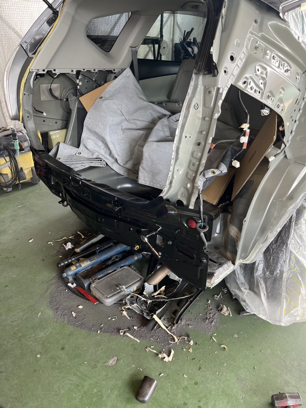 追突事故修理での入庫です。見た目以上に損傷が酷くインナーのパネルも交換しました。保険修理だったので細かい部分も全て交換して無事完成です。ありがとうございました。