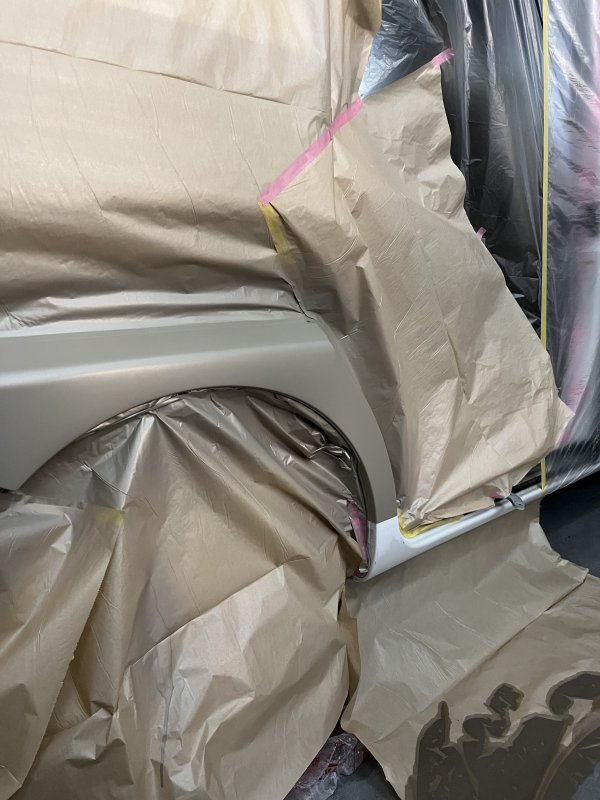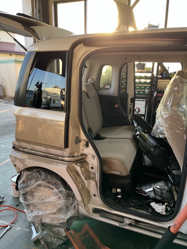 クウォーターパネルのヘコミ修理です。ヘコミが酷い状態でしたが、交換ではなく鈑金塗装で修理しました。ドアの内側もへこんでいたので、スライドドアを取り外して修理しました。ツートン塗装も違和感なく仕上がりました。