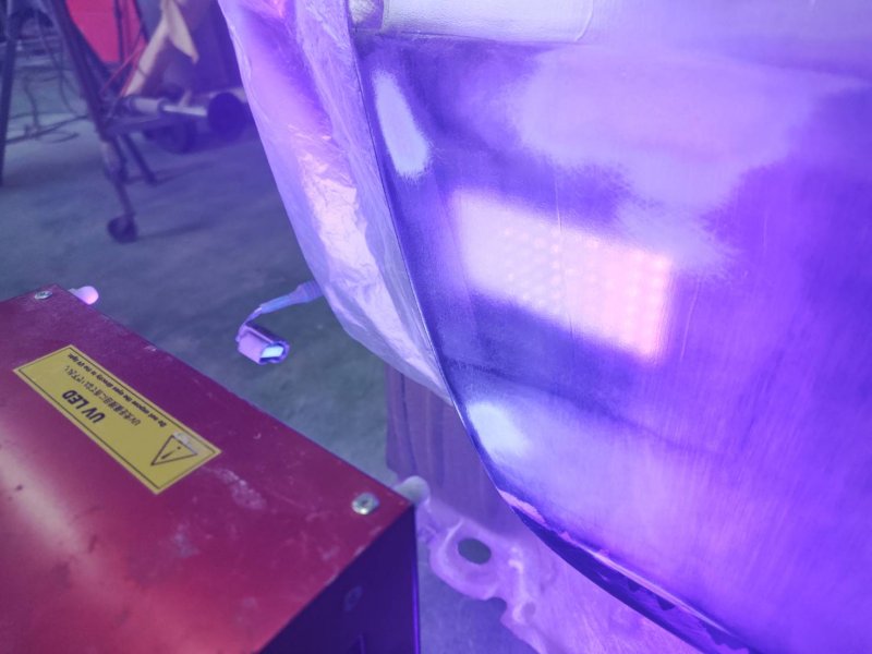 当店では、最新のUV工法を導入しており、サフェーサーなどの下地処理も短時間で硬化・固めることが可能です。従来1時間ほどかかる工程も、UV光を用いることでわずか数十秒で完了。作業効率が上がることで、修理費用の抑制にもつながります。サフェーサーは塗装前の下地処理で、パテを削った細かいキズを埋め、塗料が素材に吸い込まれるのを防ぎ、錆を防ぐ重要な工程です。