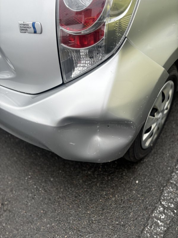 トヨタアクアにお乗りのお客様よりハンドル操作を誤りリアバンパーを外壁にぶつけてしまいへコミができた為、直しのご相談で来店頂きました。