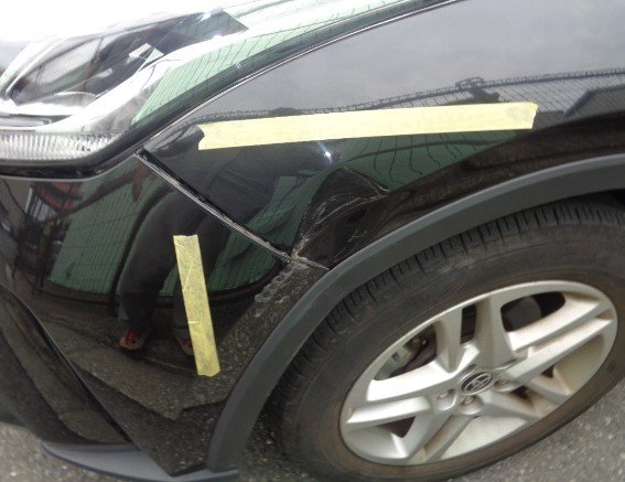 写真では少し分かりづらいかと思いますが、フロントフェンダーからバンパーにかけてへこみキズが入ってしまっておりました...