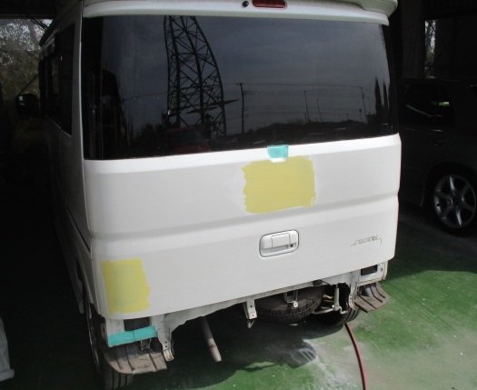 リアワイパーとリアバンパーを取り外して、バックドアのへこみキズ部分とエンブレムを取り外して出来た穴をパテを使い平らにしていき、調色したカラーで塗装していきました。