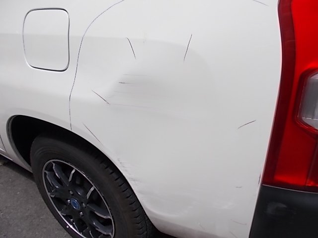 左リアタイヤ付近となります。少々見にくいかも知れませんが、擦ったキズ、ヘコミが生じております。今回はこの部分のみの修理を行います。