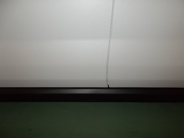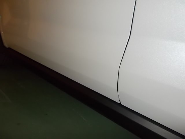 ヘコミの修理内容となります。ボディーが白い為写真にはっきり映るか心配ではありましたが、何とか損傷部のはっきりと撮影出来ました。修理前ではハッキリとヘコミが見受けられましたが、仕上がりでは、元通りの一直線のラインで完成しております。