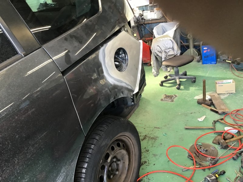先ずは、リアバンパーやテールランプなどを取り外して、左クォーターの鈑金を行いました。