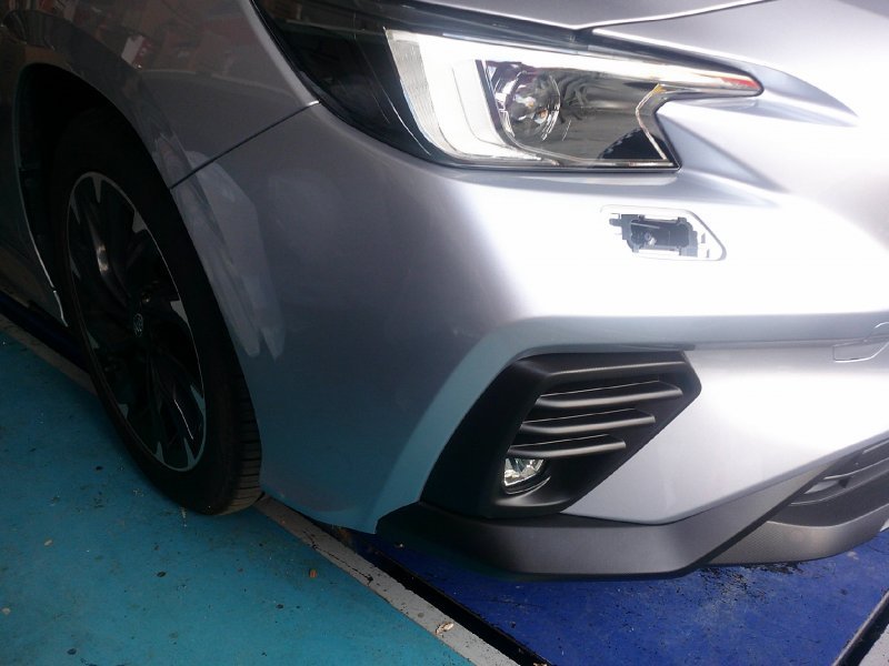 フロントバンパー右側の塗装削れとヘッドライトの交換ですがこの新型レヴォーグはフロントバンパーの両角にアイサイトのレーダーが入っている為、バンパーを修理するとレーダーがエラーを起こし最悪アイサイトのシステムが作動しなくなってしまう恐れがあります。今回は保険修理ですので、お客様負担はありませんでしたが、実費修理ですとバンパー交換とレーダー再設定のエーミング作業で10万円以上の金額がすぐにかかってしまいます。