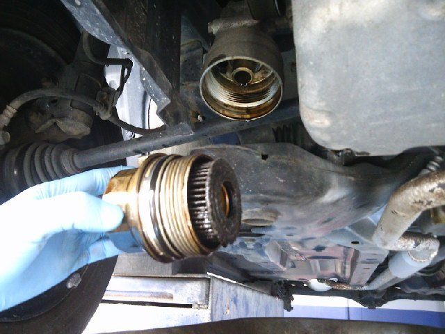 参考ですが、不幸にもドレンプラグが固着していた場合は、上図のようにエレメントが収まるケース(キャップとも言います)をバイスなどで固定しないと外せません。取付時のポイントは締付トルクをしっかり守る事です。下の写真は専用工具でケースを締付けていますが、25±5N・mのトルクで締付け、その後、ドレンプラグを12.5±2.5N・mで締付けて完了です。(なお取付前に新しいOリング全周にエンジンオイルを塗る必要があります)適当に締めると次回外れなかったり、オイル漏れを起こす恐れがありますので注意が必要です。