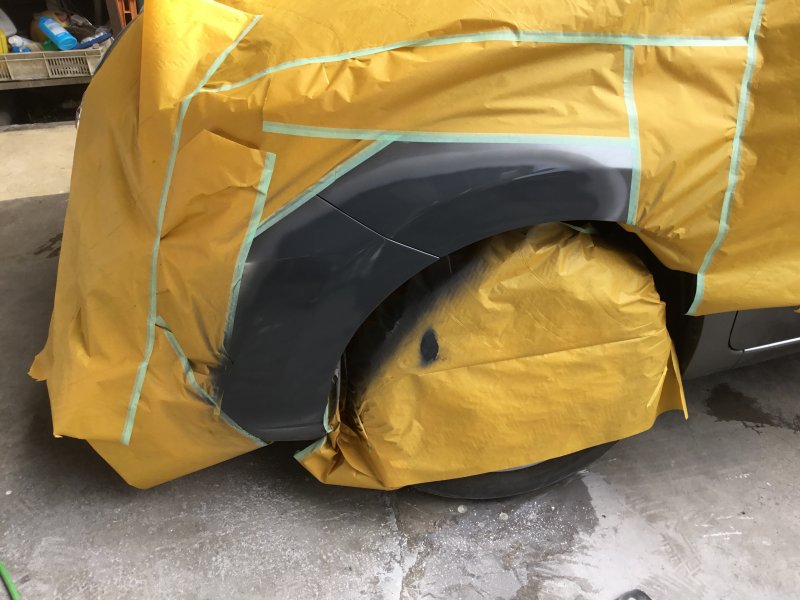 最終的に、パテを研ぎだし形が出てきたところで、周辺をマスキングして塗装に移ります。フェンダー一枚を塗る場合だと費用も高額になってしまいますので、できるだけ塗装範囲を小さくするために、うまくぼかしていきます。