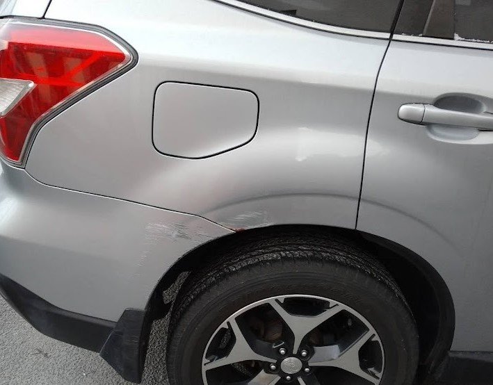熊本県熊本市南区|フォレスター(スバル)のキズ・へこみ直し事例(右後ろ タイヤ上(フェンダー) 後ろバンパー 修理 鈑金)