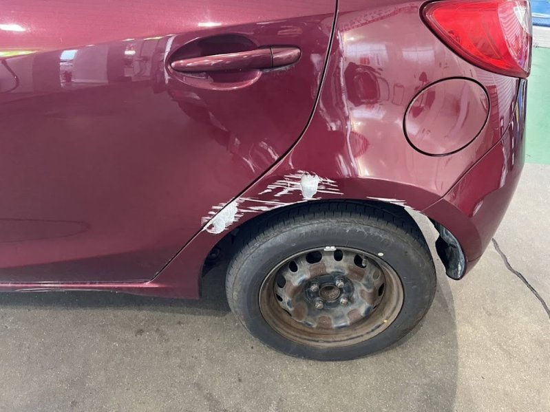 熊本県熊本市南区|デミオ(マツダ)のキズ・へこみ直し事例(左後ろドア タイヤ前(フェンダー) キズ ヘコミ 修理 鈑金)