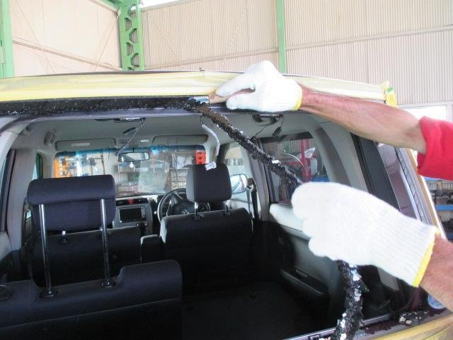 車を傷つけないようにマスキング等で養生をし、残ったガラスとセメダインをヘラで取り除いて行きます。