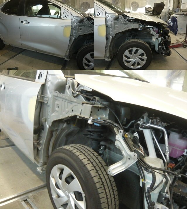 厚木市 ヤリス ヘッドライト、フロントバンパー、フロントフェンダー交換及びラジエターサポート、フェンダーエプロン、フロントドア鈑金修理