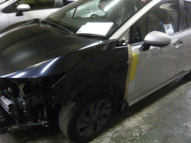 厚木市 ノート フロントバンパー、ヘッドライト、、ボンネット、フロントフェンダー、フロントドア修理
