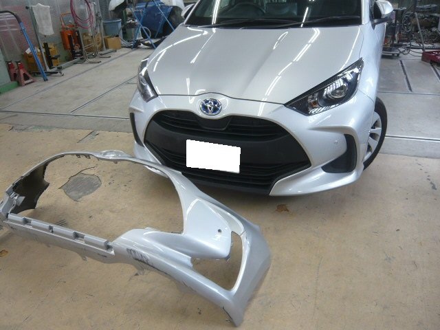 海老名市 ヤリス フロントバンパー交換、リアドア、クォータパネル鈑金修理