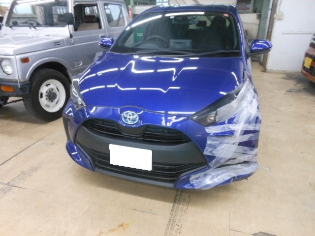 海老名市 ヤリス フロントバンパー、ヘッドライト、フェンダー交換及びボンネット、フロントドア鈑金修理