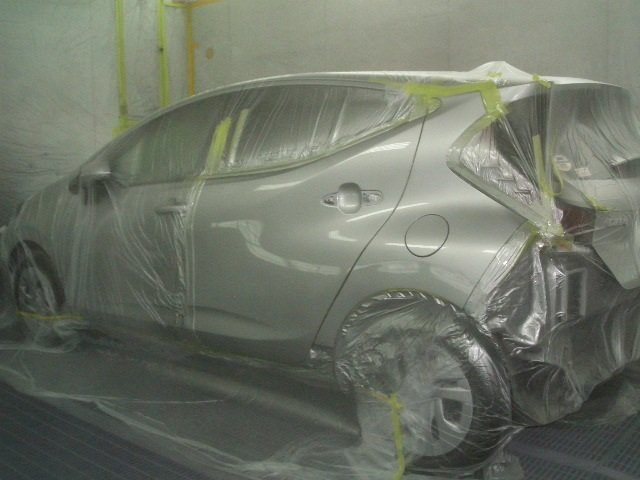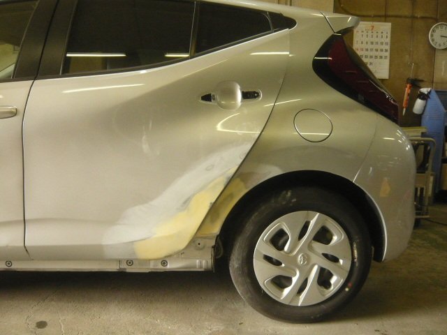 海老名市 アクア フロントフェンダー・フロントドアパネル鈑金修理及びリアバンパー交換