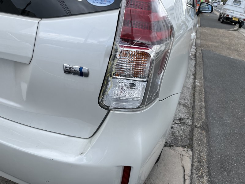 トヨタ プリウスαのリアゲートを鈑金塗装、リアバンパーの変形修正と塗装とテールランプ交換しました。