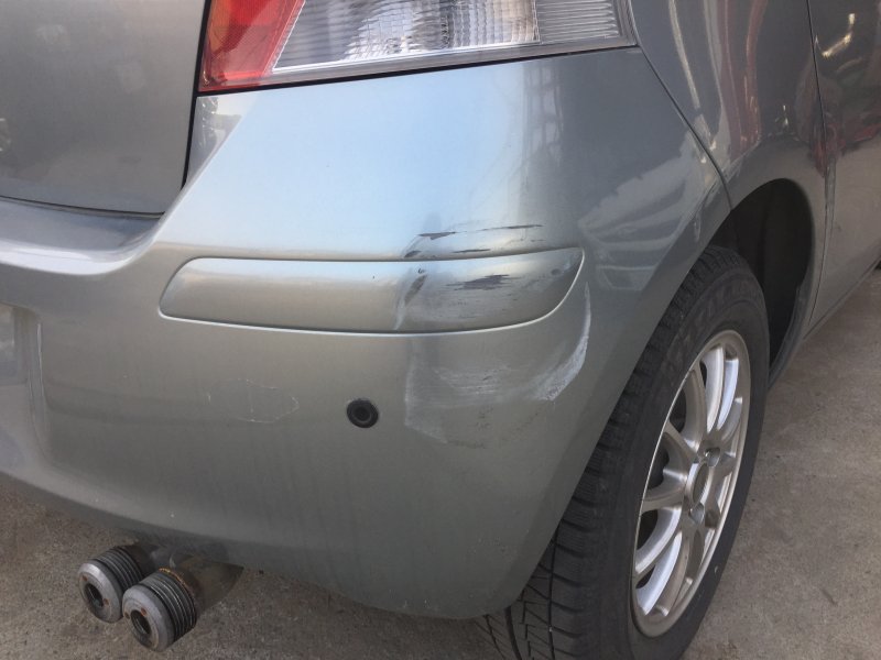 カーコンビニ俱楽部門倉です。本日はトヨタ ヴィッツのリヤバンパーの修理です。形状が複雑で難しい修理です。今回は外して1本塗装で対応いたしました。