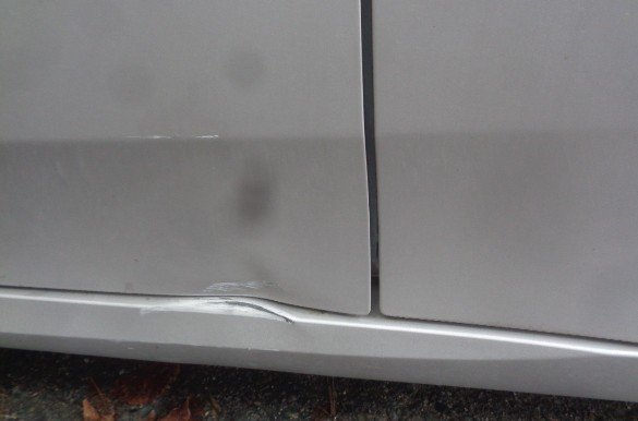 まずはダメージの程度をしっかりチェック。リアドアは中程度のヘコミ、クォーターパネルには大きな凹みとキズ、サイドステップも変形が見られました。