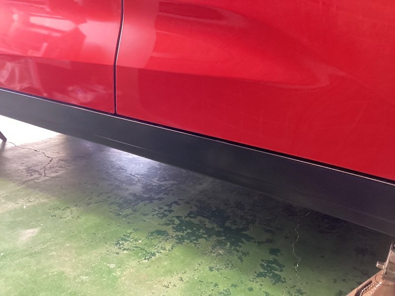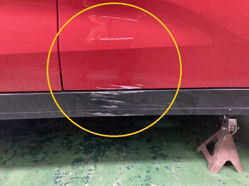 写真でもわかるように赤い色のリヤドアには、目立つ白いへこみキズが・・・ そしてその下の黒いプラスチックでできたサイドステップカバーにもガリキズが有りました。