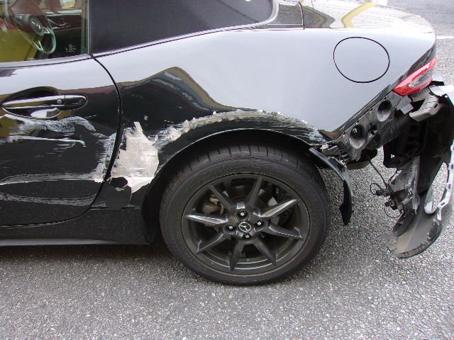 今回のご入庫はマツダ・ロードスターのフロント廻り破損、リヤ廻り破損、左側面破損修理でのご入庫です。