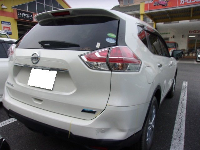 【埼玉県 坂戸市 鶴ヶ島市 川島町 川越市 桶川市 日高市】ニッサン・エクストレイル、平成27年6月式、グレード 20X HIBRID EブレーキP、DAA-HT32、リヤバンパー交換(取替)作業、右クオーターパネルキズ・ヘコミ修理作業、右後ろキズ・ヘコミ修理、右リヤ角廻り凹み修復、新品部品交換したくない、リサイクル部品(中古部品)検索、高額修理、高額見積、最安値、激安鈑金塗装、最短修理日数時間