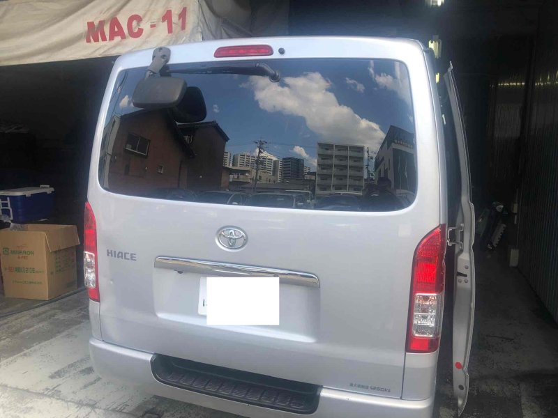 名古屋市中村区名駅5分google評価4.3!トヨタハイエースレジアスバンのリヤゲート鈑金塗装、中古ガラス取替