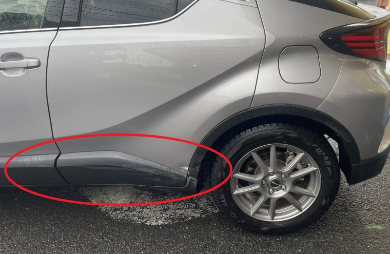 左リアドア下部からサイドシルにかけて、擦りキズおよび変形が確認されました。特にドア下部とサイドシルの境目付近にダメージが集中しており、擦過による塗装剥がれと軽度の歪みが発生している状態でした。