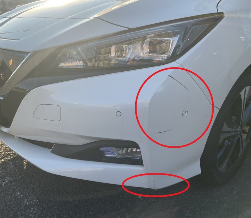 【 ニッサン リーフ フロントバンパー 鈑金 塗装 修理 】 キズ へこみ 茨城県 水戸市 鈑金塗装修理事例