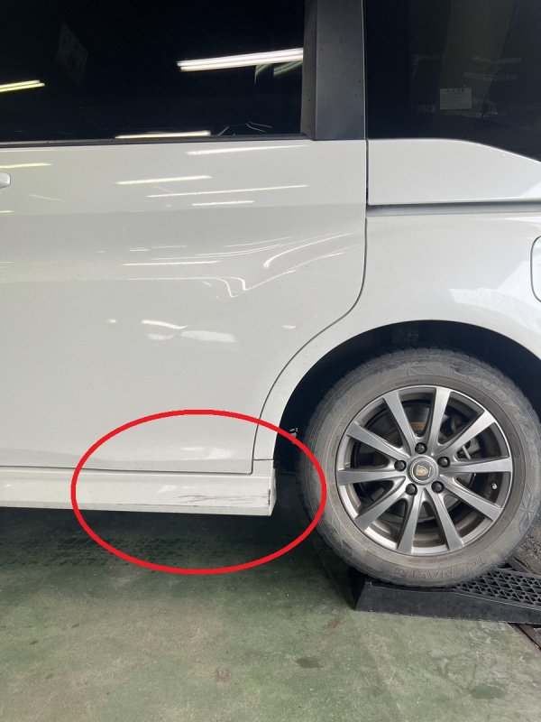 サイドシルガーニッシュ(ドア下部の部品)にキズが見られました。見た目の損傷だけでなく、取付部の浮きも確認されました。