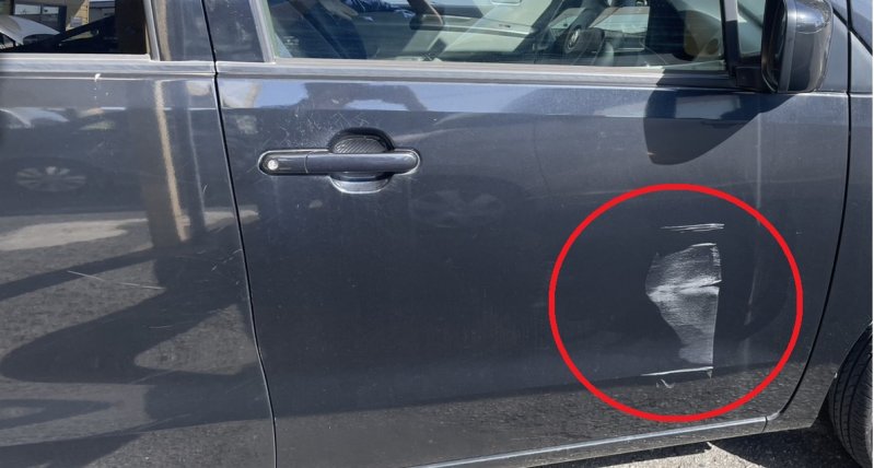 フロントドアの下部に白く目立つキズがあり、サイドミラーにも損傷が見られました。お相手がいる事故とのことで保険で修理することになりました。