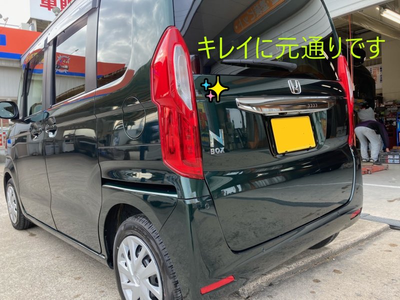 愛知県半田市|N-BOX(ホンダ)のキズ・へこみ直し事例(バックドアへこみ修理・バンパ交換・リアフェンダー修理・テールランプ交換)