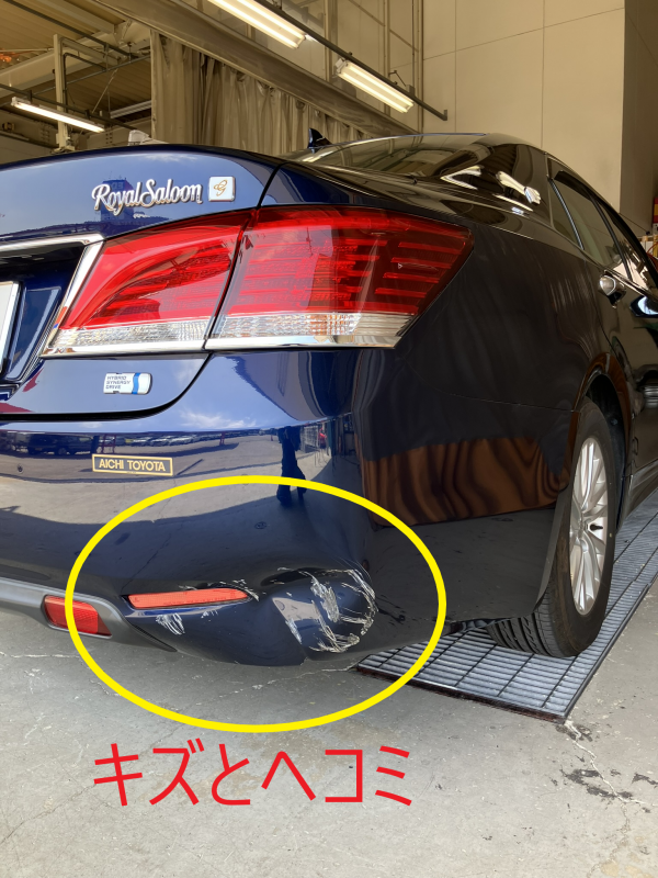 トヨタクラウンのバンパーに大きなヘコミと深いキズ…。