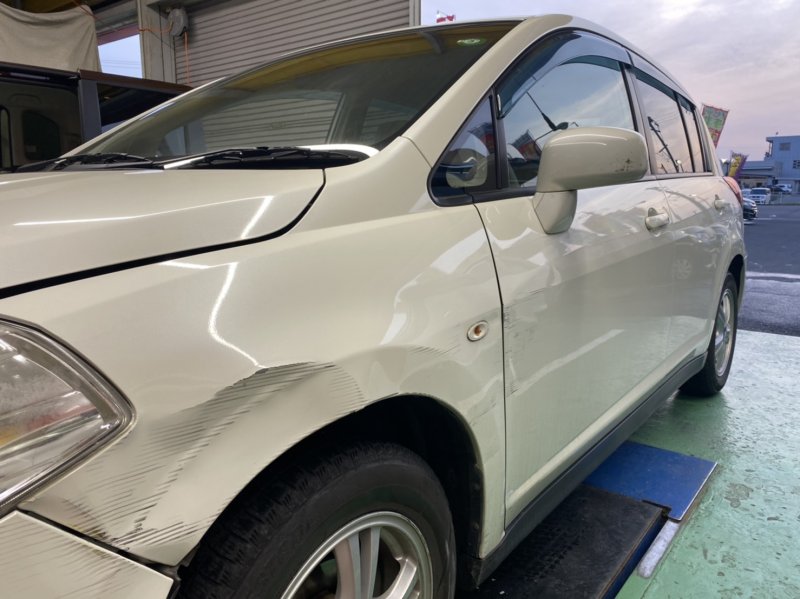 岐阜県大垣市|ティーダ(日産)のキズ・へこみ直し事例(フロントバンパー フロントフェンダー修理)