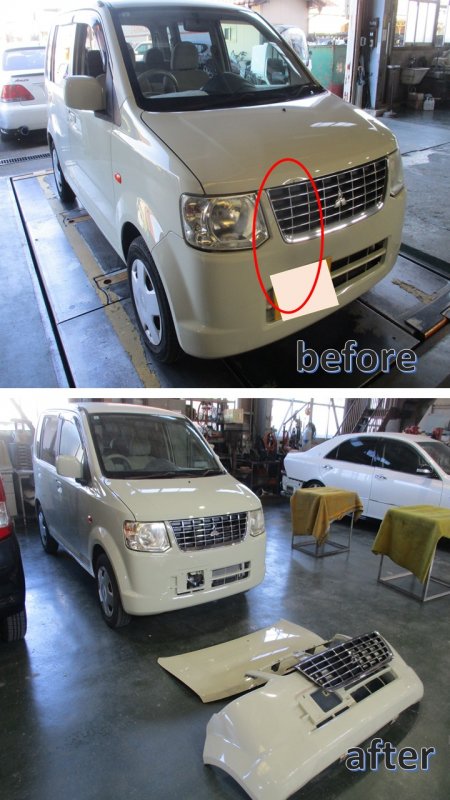 愛知県一宮市|ekクラッシー(三菱)のキズ・へこみ直し事例(ボンネット、フロントバンパー保険修理)