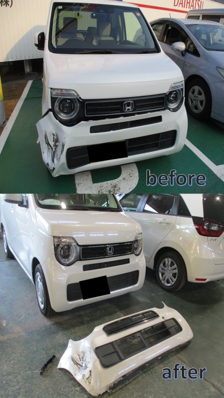 愛知県一宮市|N-WGN(ホンダ)のキズ・へこみ直し事例(フロントバンパー、内部骨格、保険修理対応。)