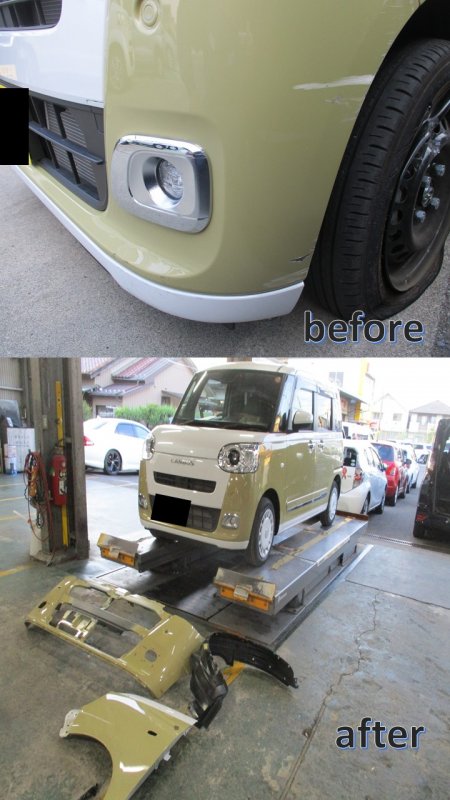 愛知県一宮市|キャンバス(ダイハツ)のキズ・へこみ直し事例(フロントバンパー、左側フロントフェンダー車両保険修理)
