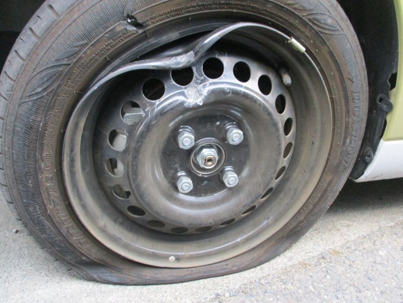 ダイハツキャンバス フロントバンパー、左側フロントフェンダー、左側フロントタイヤ、ホイール交換、鈑金修理になります。画像ではわかりずらいですがホイールが大きく破損しタイヤもパンクしています。今回は車両保険にて修理しました。車両保険を使用すると保険等級が3等級下がりますが修理金額に応じて活用するなどアドバイスも賜ります。年間の保険料金と保険を使用した場合の掛け金の差額などで利用する、利用しないなどご相談ください。