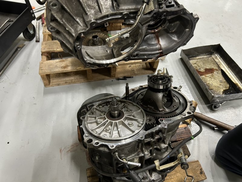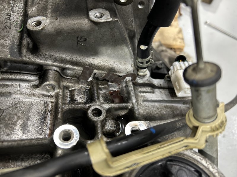 原因はオートマケースのパッキンが割れていて、部品交換にはミッションを降ろして分解する必要がある為、エンジン&オートマを降ろしての作業となりました。