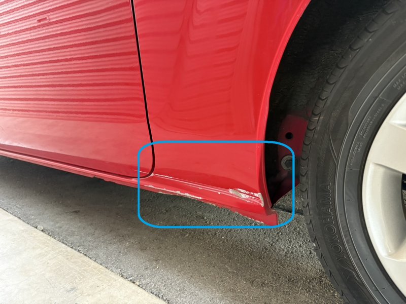 お車のサイド部分、フロントドアとクオーターパネルにキズとヘコミができてしまったとのことでご相談をいただきました。