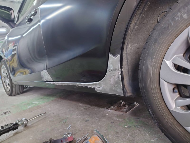 奈良県大和高田市|デミオ(マツダ)のキズ・へこみ直し事例(左フロントドア リアドア ステップ)