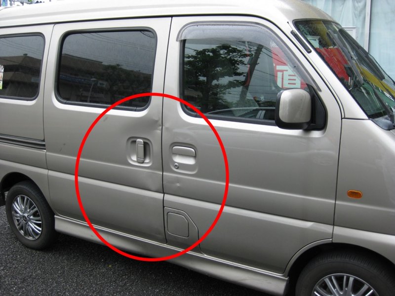 江戸川区 鹿骨 スズキ エブリィワゴン ジョイポップターボPZ 保険修理 鈑金塗装 フロントドア、スライドドア(リヤドア)、センターピラー(Bピラー)の大きなへこみ修理事例