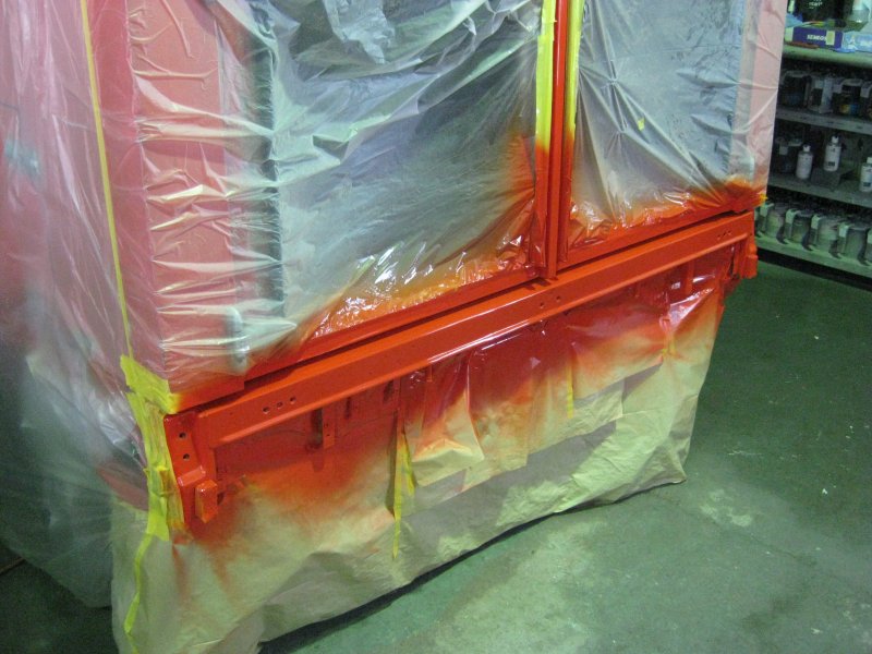 後側のリヤエンドパネル(バンパー付近)鈑金した後に、マスキング(養生)をして塗装をします。